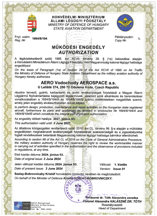Vodochody, 2. července 2024 – Společnost Aero, největší letecký výrobce v České republice, obdržela oficiální Oprávnění k vývoji, výrobě, údržbě a provádění oprav maďarských státem registrovaných letadel, letadlových částí a zařízení. Osvědčení se týká letounů L-39NG, které Aero dodá maďarským vzdušným silám a formálně uznává způsobilost konstrukčních, výrobních a opravárenských organizací Aero.